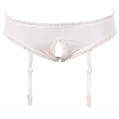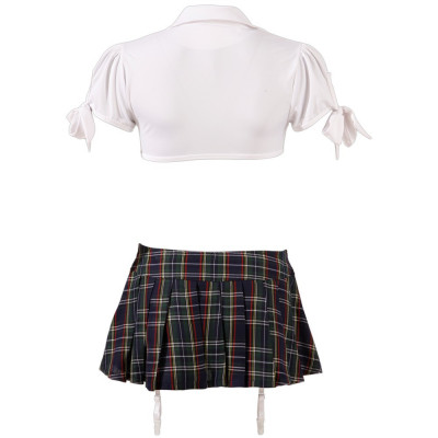 Mozzafiato!!! Abito sexy composto da: • Cravattino in fantasia scozzese; • Top bianco con scollatura vertiginosa; • Minigonna pieghettata coordinata al cravattino; • Slip bianchi con bordi ricamati, laccetti reggicalze e due eccitanti aperture: una frontale ed una sui glutei. Materiale: • Cravattino e minigonna: 100% Poliestere; • Top e slip: 95% Poliestere, 5% Elastan.