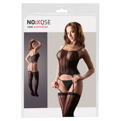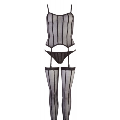 Sensuale e provocante. Ecco come questo corsetto coordinato formato da top, string, reggi calze a righe e calze vi farà apparire. • Colore: Nero. • Materiale: 100% poliammide.