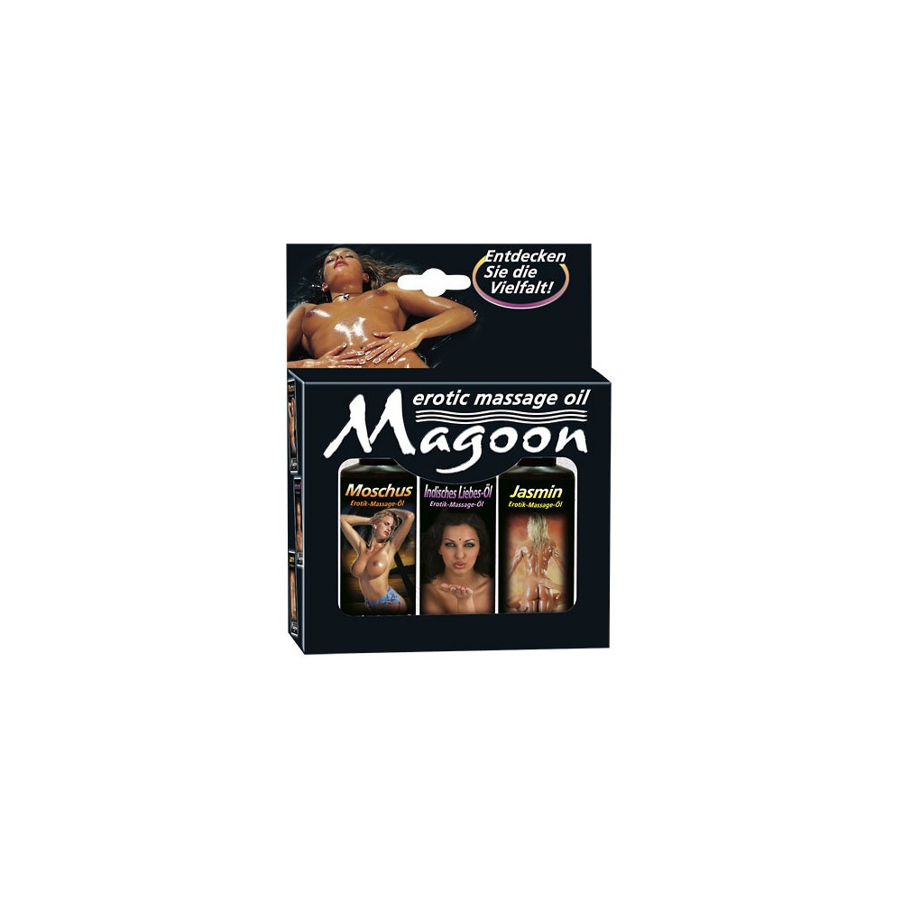Confezione contenente 3 differenti oli per massaggi Magoon, dalle variegate fragranze, in modo da accoppiare ad ogni tuo momento d'amore quella giusta.