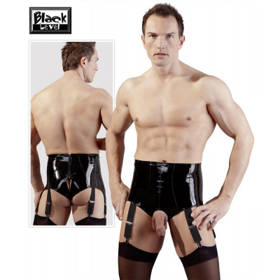Boxer in latex nero con apertura frontale sul cavallo e cerniera sul posteriore. Bel 6 reggicalze extra larghe e staccabili.