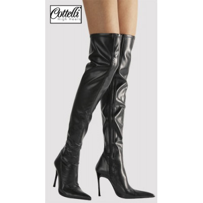 Stivali alti fin sopra al ginocchio in colorazione nero e materiale similpelle. Laccato all'altezza tacco. Comoda cerniera interna.
