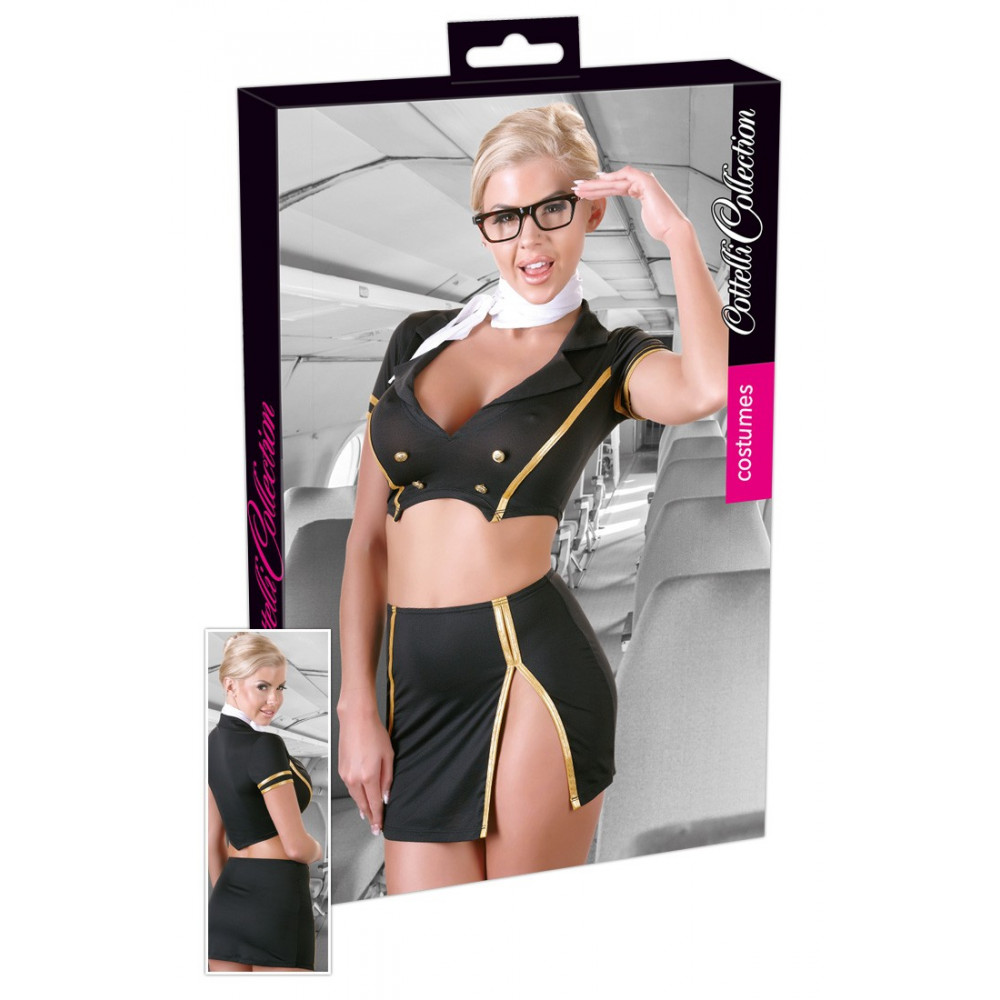 Realizzato in morbido tessuto con inserti in raso e raffinati decori color oro da assistente di volo. Comprende il top e il foulard bianco da Sexy Hostess. La mini gonna con ampio spacco sulla gamba sinistra, completa questo costume rendendolo \"irresistibile\".
