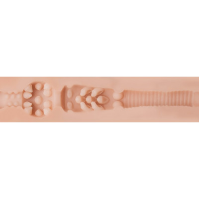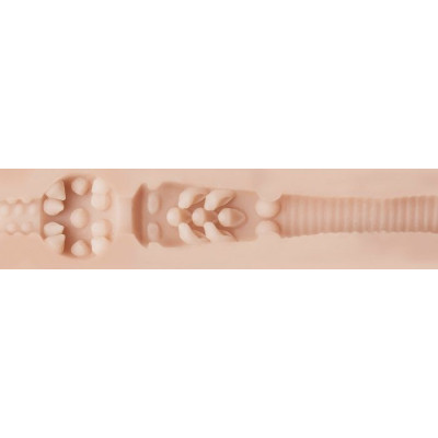 All'ingresso, tre piccoli anelli di protuberanze ti afferreranno strettamente, seguiti dalla cupola del piacere ultra penetrante che ti darà una felicità senza pari a 360 gradi. La camera successiva inizia con una piccola fila di denti e zanne che si sfregano e ti attraggono deliziosamente. Infine, una fila di grandi protuberanze porta a una trama super costolata che si restringe più lontano si entra all'interno.